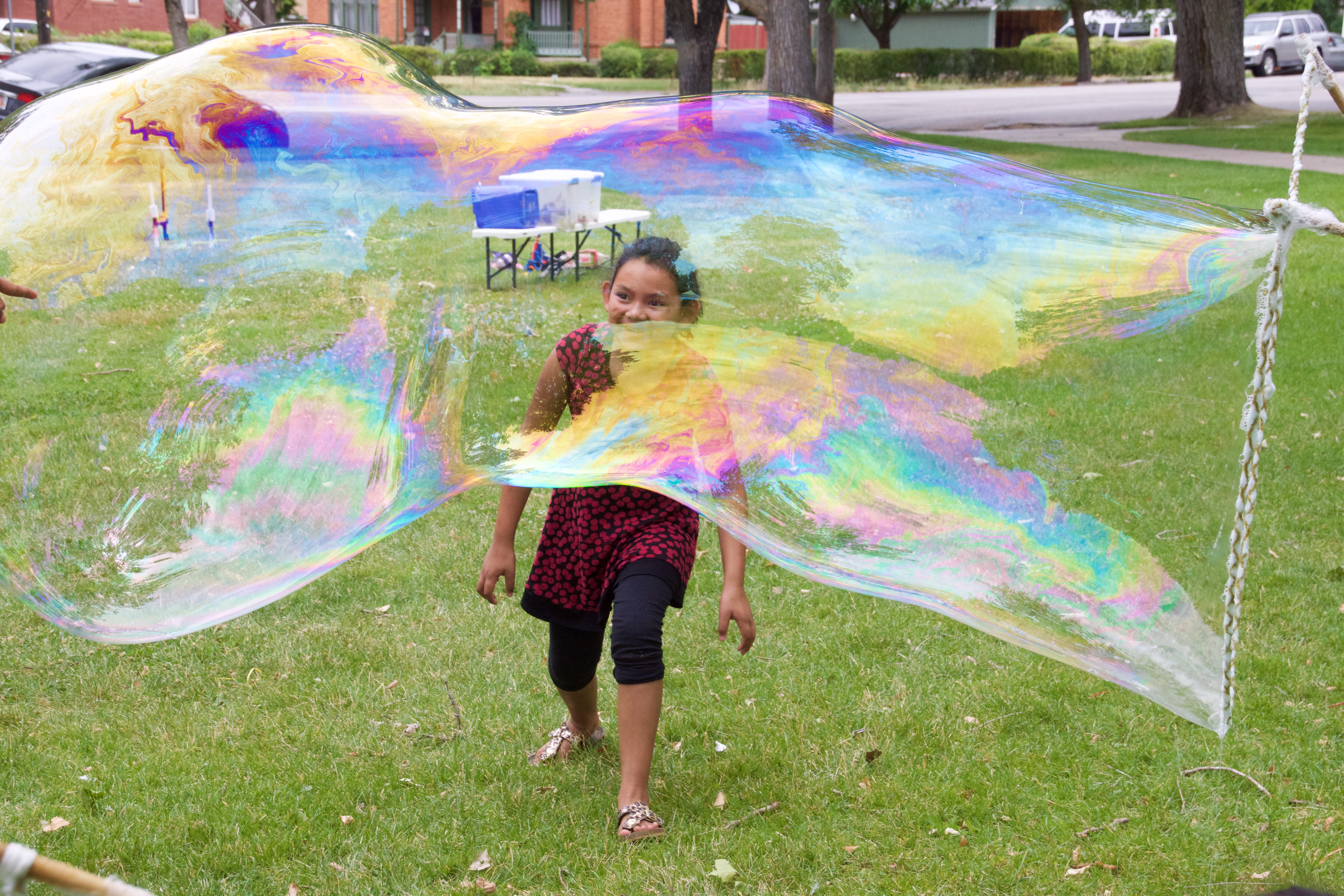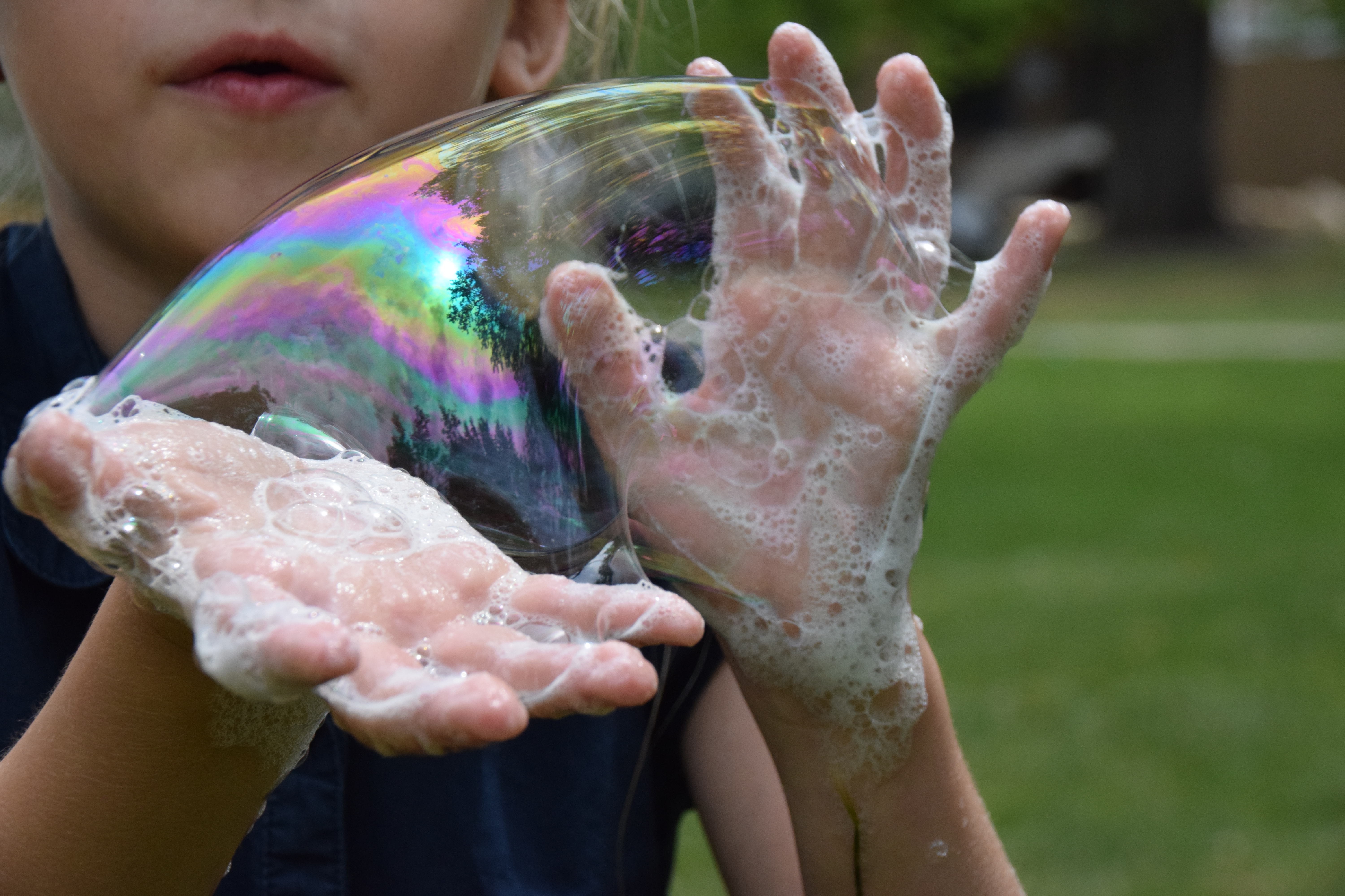 What I really love about bubbles is that there is so much to observe and do with them. First, they make these great spheres of almost-nothingness. They have all kinds of colors; they wobble; they flow around the edges and drip from the bottom; and when they pop they spring back on themselves and then leave behind a shred of their bubble skin. And, when you have buckets and a kiddie pool of our solution, you can blow all kinds of varieties of sizes from straws or wands or pipes or even your own two hands.