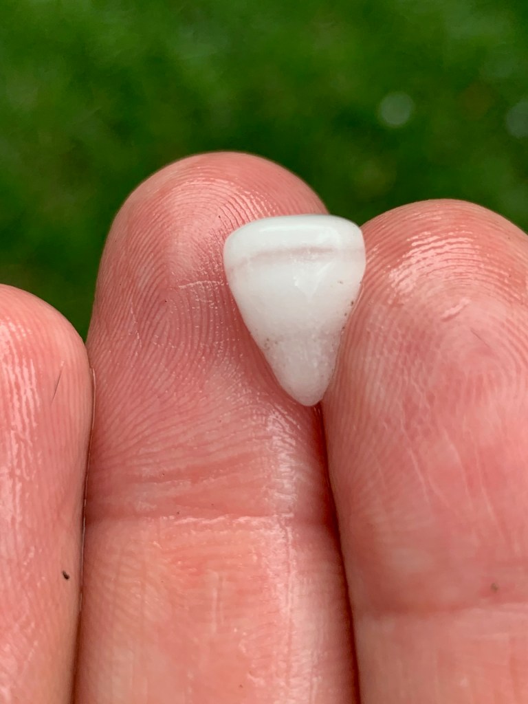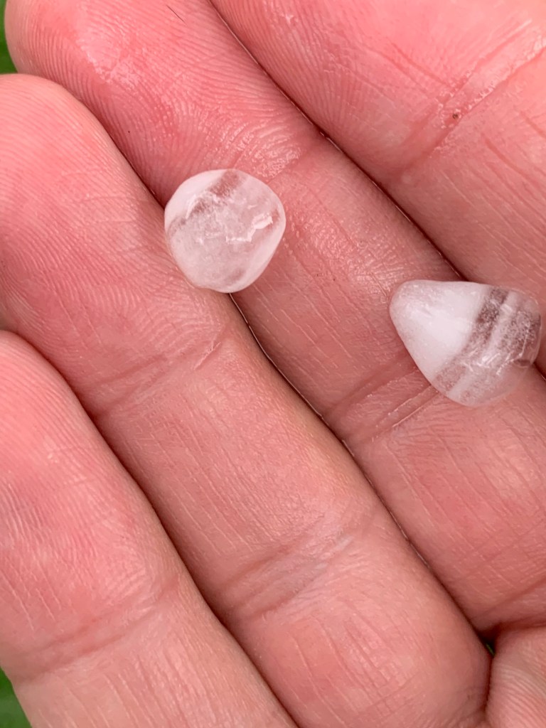 When I saw this hail up close I noticed a few more features that surprised me. First, it wasn’t round. It looked like a tooth or a candy-corn or a mini-pyramid. And also, it looked like it had stripes or layers. I thought I might just be imagining this, or maybe this was just a random strange piece of hail. So I started looking around in the grass more. I started to find these striped “teeth” hail all over!